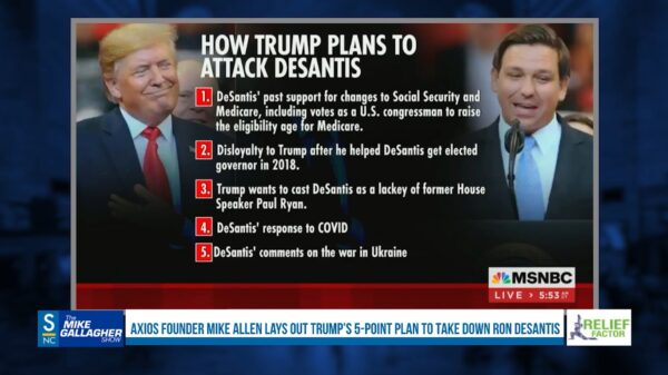 Read MoreAxios Founder Mike Allen explained that Donald Trump has a five point plan to take down Gov. Ron DeSantis. GALLAGHER: Here is Mike Allen, Founder of Axios, which is an inside the beltway publication online. I read it every morning. They are left leaning and they are mainstream media, but they are...