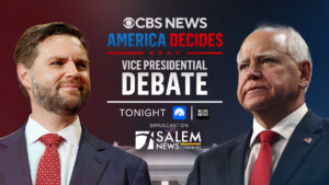 From Radio Online, “Salem Radio Network (SRN) and the Salem News Channel (SNC) will simulcast the CBS News Vice Presidential Debate tonight beginning at 9pm ET. The 90-minute debate between Governor Tim Walz (D-MN) and U.S. Senator JD Vance (R-OH) will be moderated by “CBS Evening News” anchor Norah O’Donnell and Margaret Brennan, host of “Face the Nation.””
