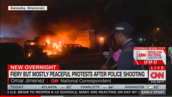 “Fiery But Mostly Peaceful Protests After Police Shooting,” is what CNN’s headline read while reporter, Omar Jimenez, stood in front of several burning cars.